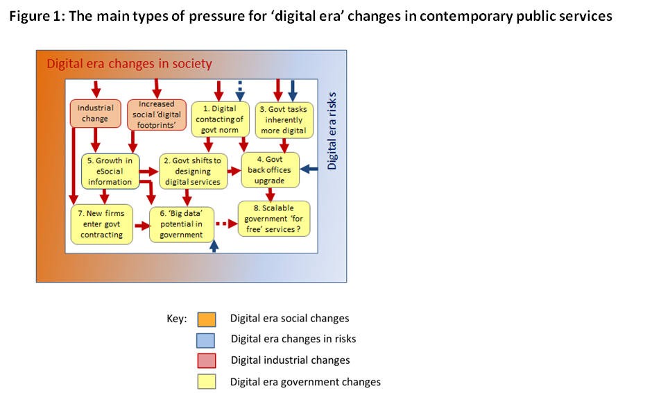 Yet relatively few interviewees’ felt that they had a comprehensive overview, and so we have compiled Figure 1, which shows the key pressures and trends pointed to by our interviewees as a whole. In the top left corner we locate the two external trends that interviewees saw as having most impact on government, namely the growth of new industrial giants such as Google, Facebook, Amazon and Twitter on the one hand; and the readiness of consumers to increasingly live their lives digitally and online, in the process making huge amounts of information about themselves available to commercial and civil society actors. As Figure 1 illustrates, these and other changes have precipitated some very substantial challenges for Australian public service agencies as a whole. By any standards the digital agenda here is a huge one. Yet the final component of Figure 1 in the right hand margin box stresses that ‘digital era’ risks have also grown. These include threats from cyber-attacks and e-security breaches; digital expansions in the competencies of criminals, terrorists and hackers; and scale increases in the scope of consequences if contemporary digital security or storage provisions are breached, deliberately or inadvertently.
