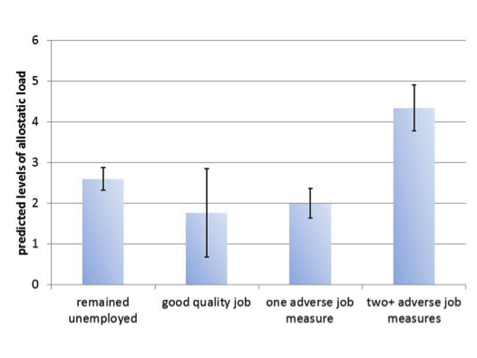 However, contrary to the “any job is better than no job” assumption, we found that the improvements in the mental health of formerly unemployed adults who became reemployed in poor quality work (with two or more adverse job measures) were not any different from their peers who remained unemployed. More significantly, as shown in the figure below, those who were working in poor quality work actually had higher levels of allostatic load (chronic stress related biomarkers) than their peers who remained unemployed.