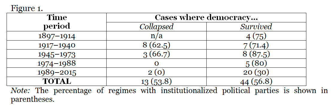Despite the unanimous agreement on the importance of both party and party system institutionalisation for the survival of democracy, it was only very recently put to the test. In an article for West European Politics, I examined the relationship between institutionalisation and democracy in 64 European political regimes since 1848. What I found is that it is not the institutionalisation of political parties but the institutionalisation of party systems as a whole that has had a positive effect on a democracy's prospects of survival. In particular, and contrary to what most scholars and practitioners take for granted, I found no relationship between a weaker institutionalisation of parties and democratic collapse (see figure 1). Not only there have been countries where democracy collapsed despite highly institutionalised parties (e.g. inter-war Finland, as well as the Hellenic and First Austrian Republics), in most post-communist countries democracy has survived despite the presence of very weakly institutionalised political parties (mainly in Georgia, Latvia, Poland and Slovakia).