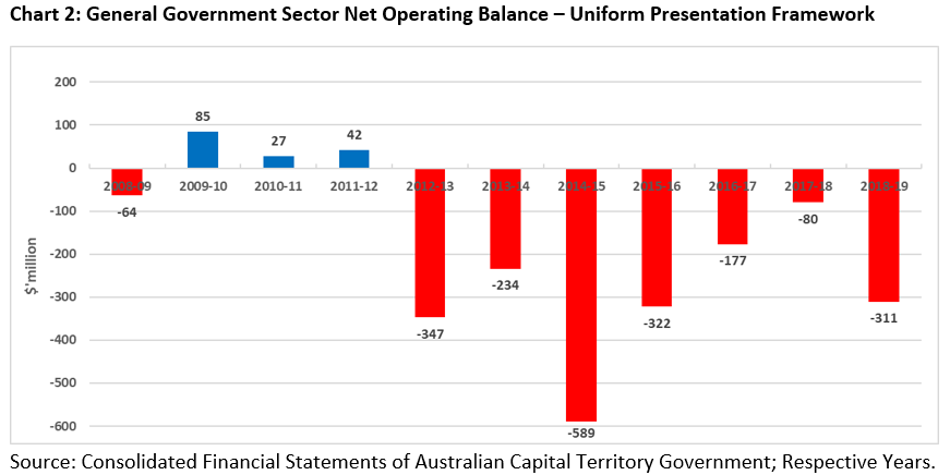 It is pertinent to note that the Uniform Presentation Framework (UPF) is utilized throughout Australia, by agreement between the Commonwealth and all State and Territory Governments and provides a common reporting basis for financial information in budget papers, budget updates and budget outcome reporting, in all jurisdictions. Chart 2 below illustrates the ACT Government Net Operating Balance (NOB) over the 10-year period from 2008-09 to 2018-19.
